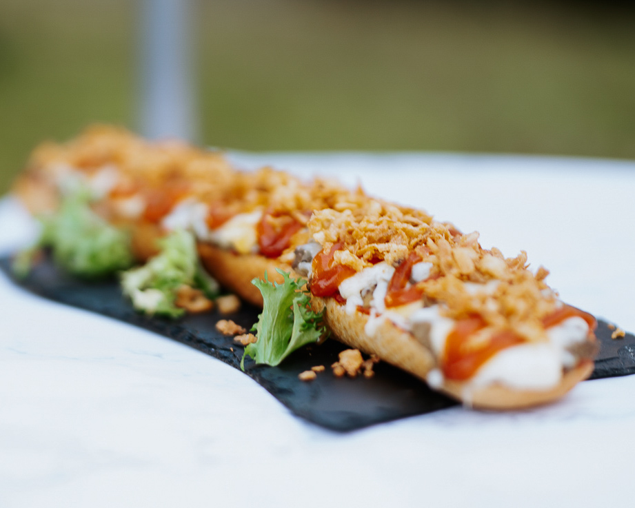 Zachwyć się smakiem chrupiącej bułki prosto z piekarni, sosem i pieczarkami domowej roboty, a także mięsem i warzywami od okolicznych dostawców.