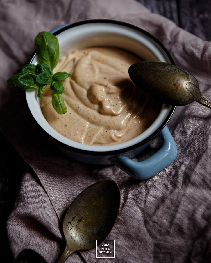 Bazą tego sosu jest majonez – najbardziej bogaty w tłuszcz (bo majonez to przecież tłuste, słoneczne żółtka i jeszcze bardziej tłusty olej), czyli główny nośnik smaku w wypadku większości zimnych dodatków. Do majonezu – musztarda i ketchup w odpowiednich proporcjach. Suszona cebula, suszony czosnek i ostra papryka tylko podbijają smak – cebula podkręca kremowość i słodycz majonezu, papryka zaokrągla smak pomidorowego ketchupu a czosnek dodaje aromatu musztardzie.